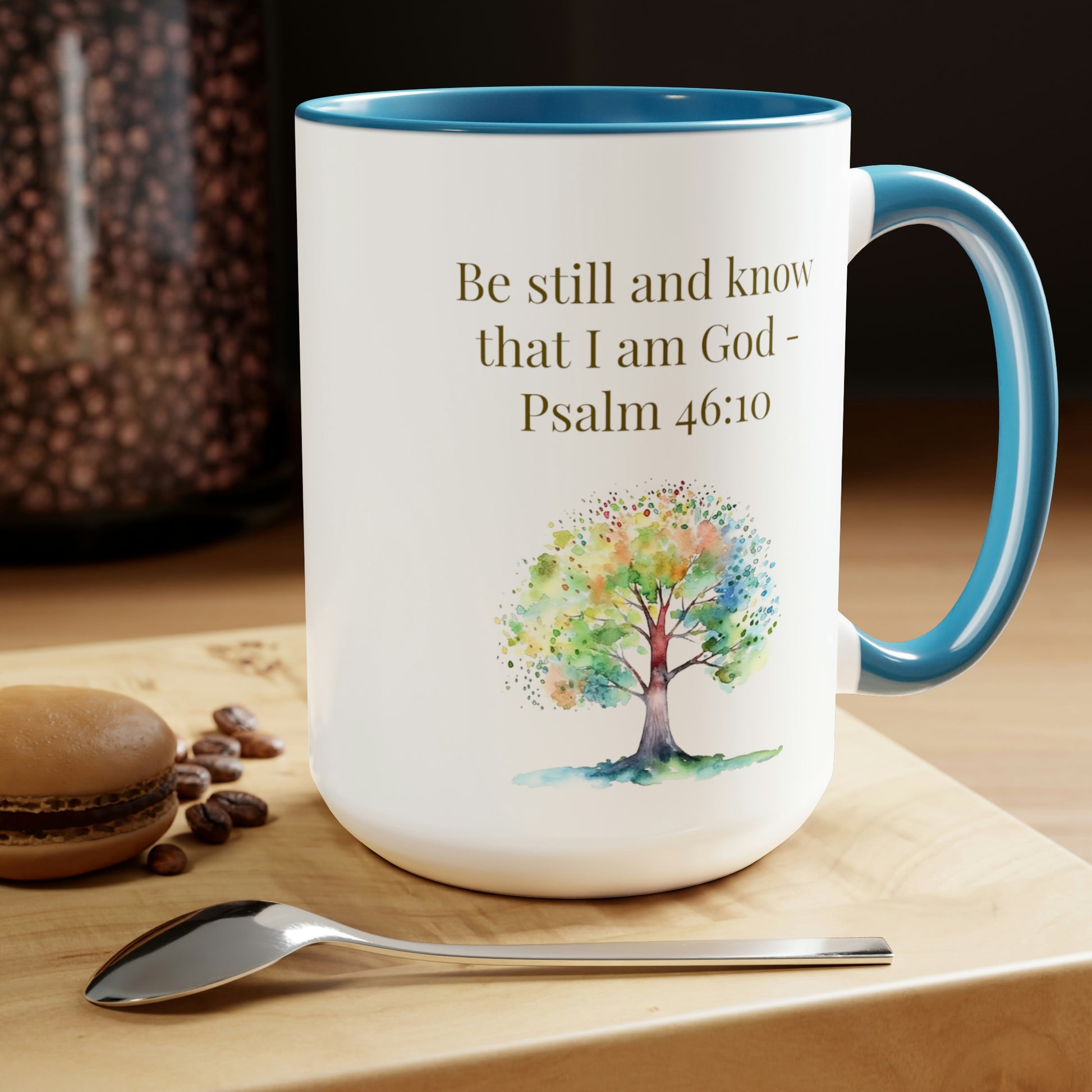 Introducing our Be Still and Know Psalm Two-Tone Coffee Mug, designed to bring both inspiration and style to your morning routine. This 15-ounce mug features a vibrant colored handle and interior, available in 2 different color options, adding a touch of personalization to your drinkware collection.
