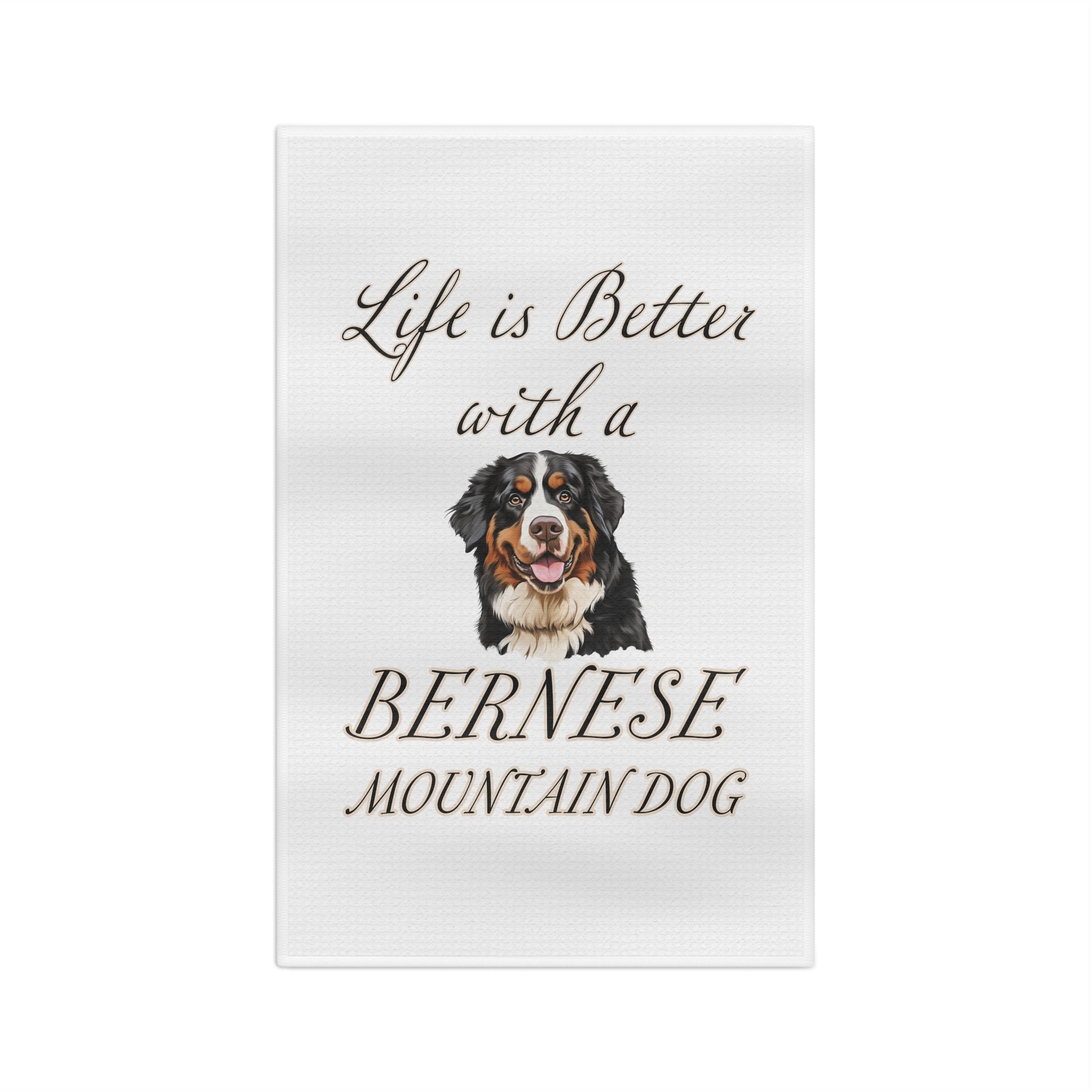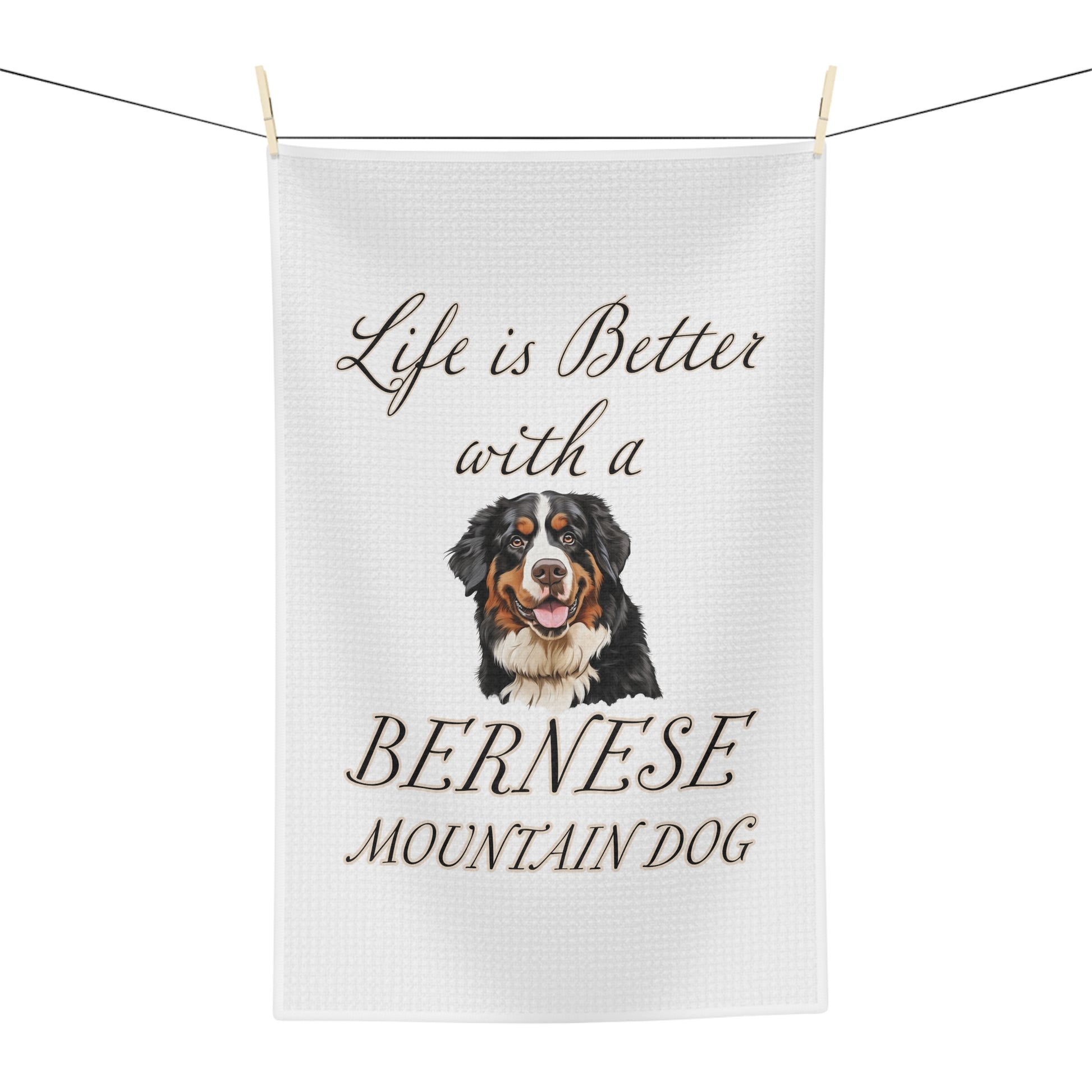 Our Life is Better with a Bernese Mountain Dog tea towel is more than just a kitchen accessory; it's a celebration of the joy and companionship that Bernese Mountain Dogs provide. It's a reminder that even the simplest moments, like cooking and cleaning, are better with a furry friend by your side. Order now and infuse your kitchen with the warmth and charm of a Bernese Mountain Dog, making every day a little brighter and every task a little lighter.
