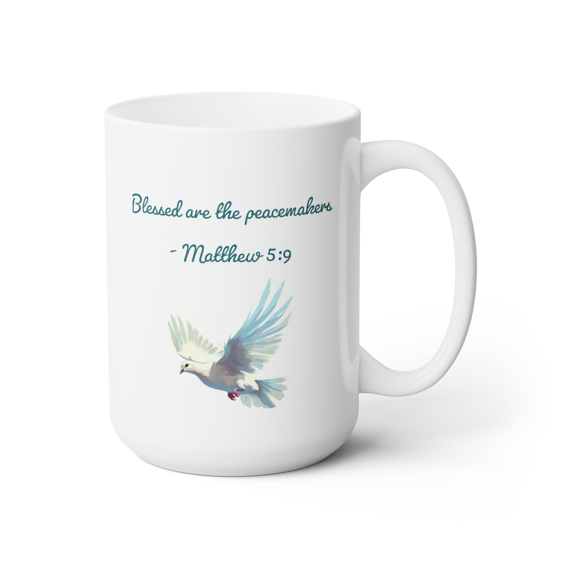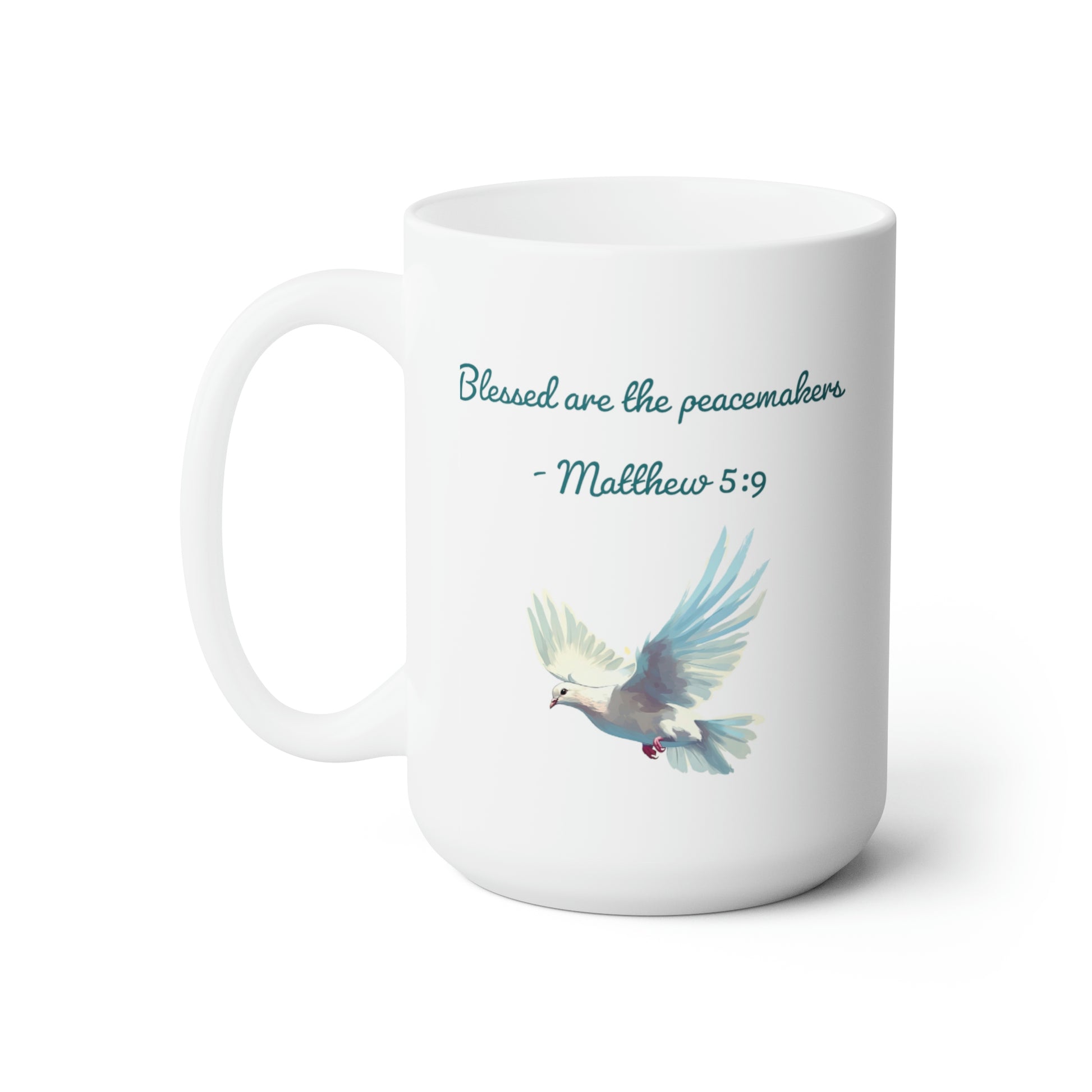 Welcome to our "Blessed are the Peacemakers" coffee mug, a special part of our Biblical collection. This mug is a daily reminder of Matthew 5:9, perfect for starting your day on a positive note. The 15-ounce white ceramic mug boasts a beautiful inscription of the revered verse, making every sip meaningful.