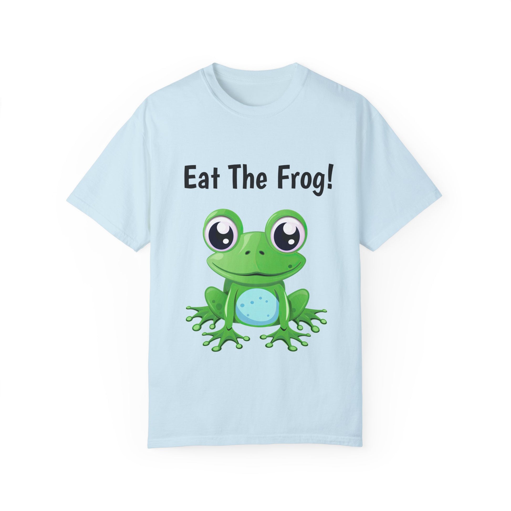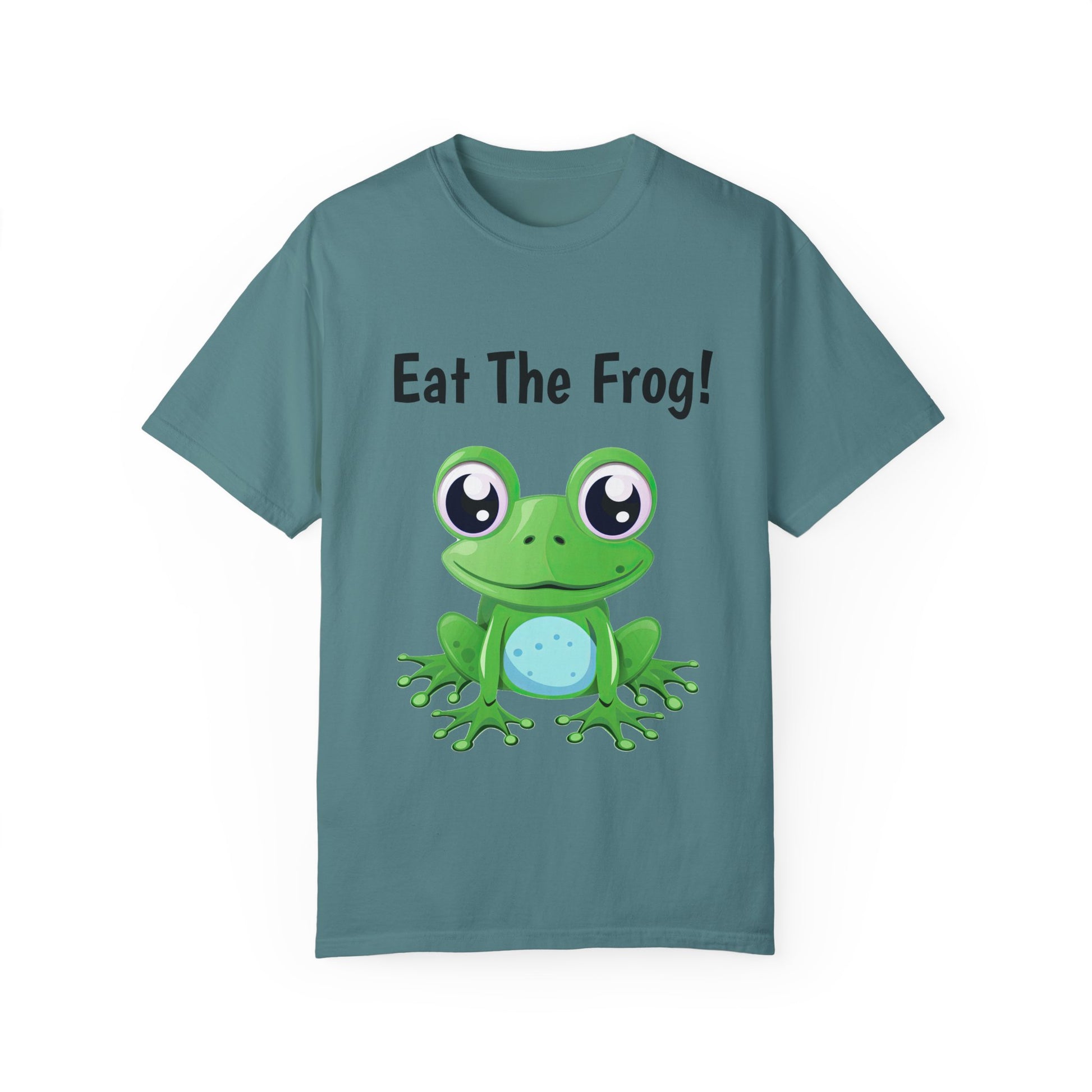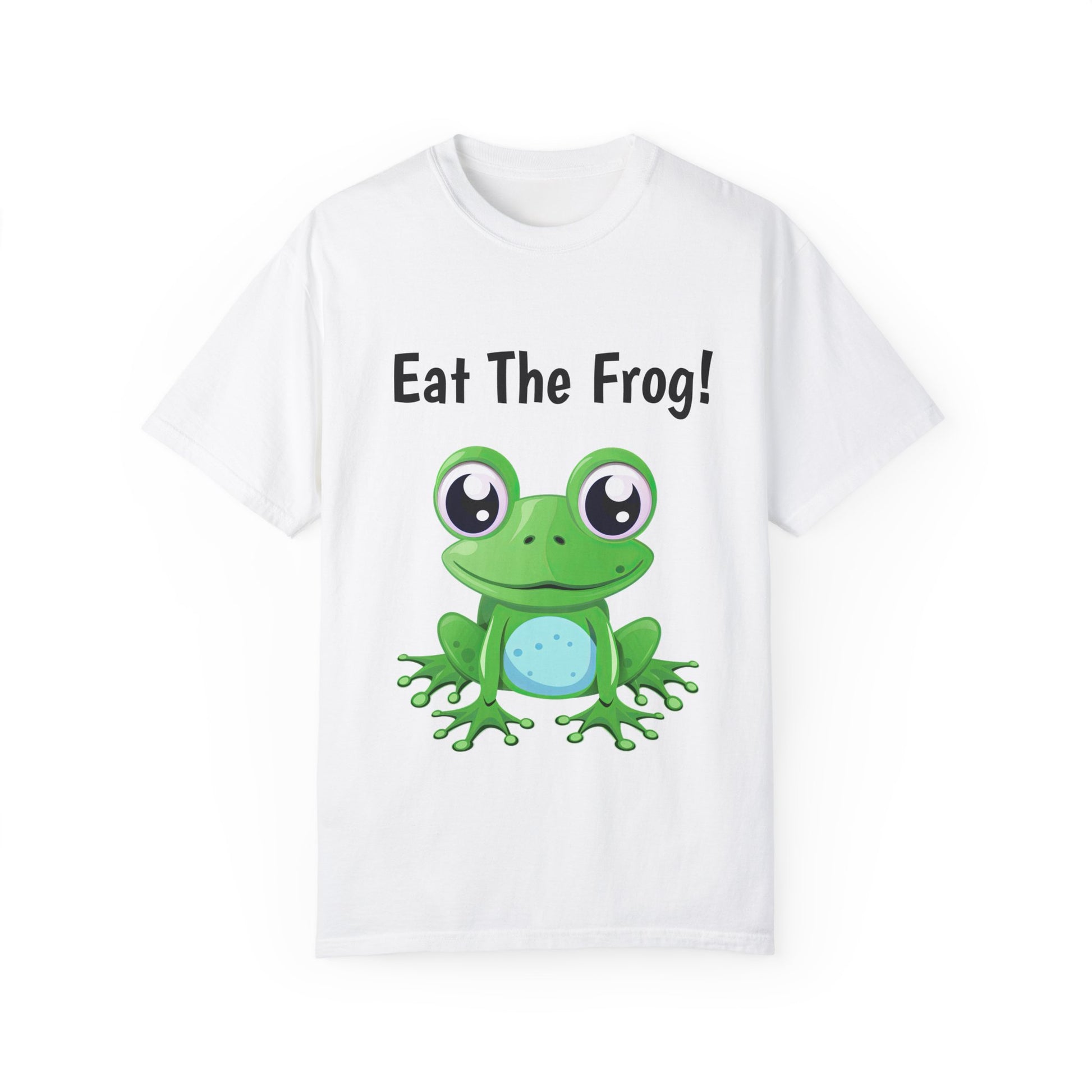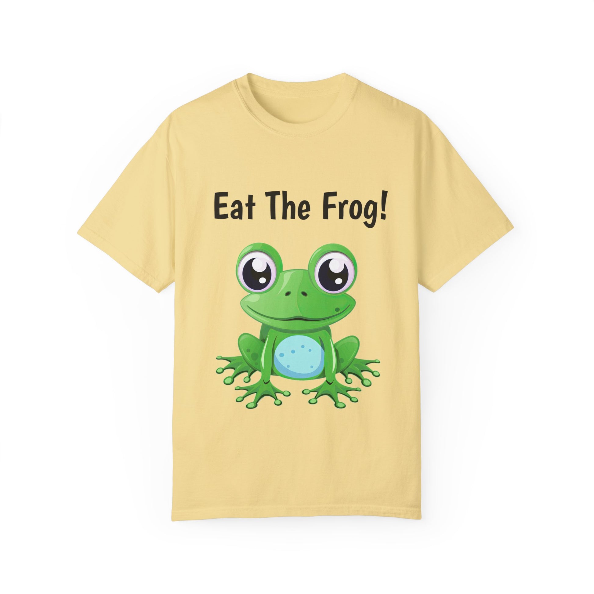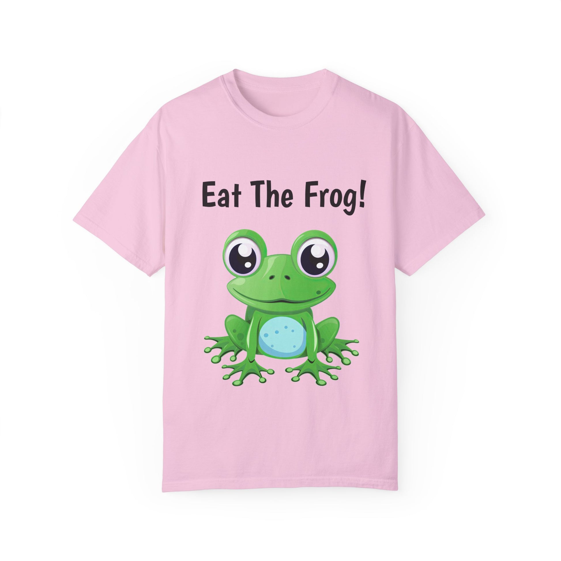 Inspirational Eat the Frog! T-shirt. Comfort Colors introduces its garment-dyed t-shirt; a fully customizable tee made 100% with ring-spun cotton. The soft-washed, garment-dyed fabric brings extra coziness to your wardrobe while the relaxed fit makes it an excellent daily choice. The double-needle stitching throughout the tee makes it highly durable while the lack of side-seams helps the shirt retain its tubular shape.
