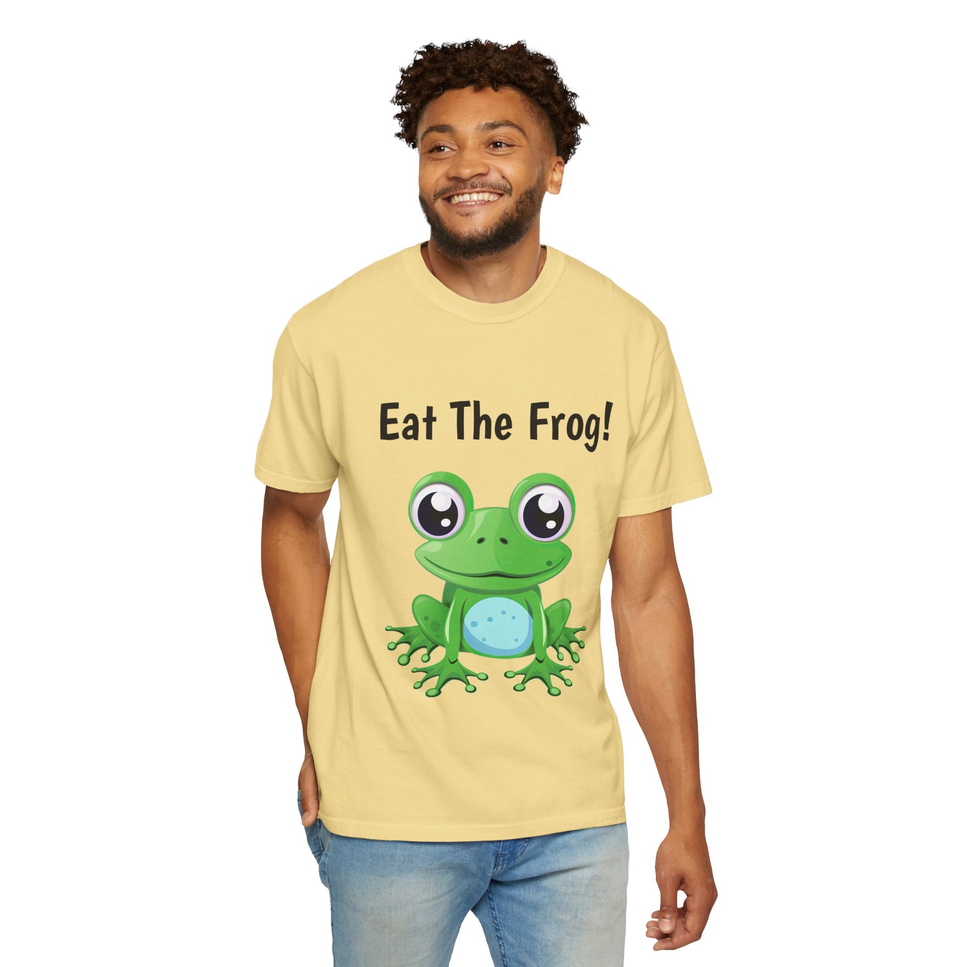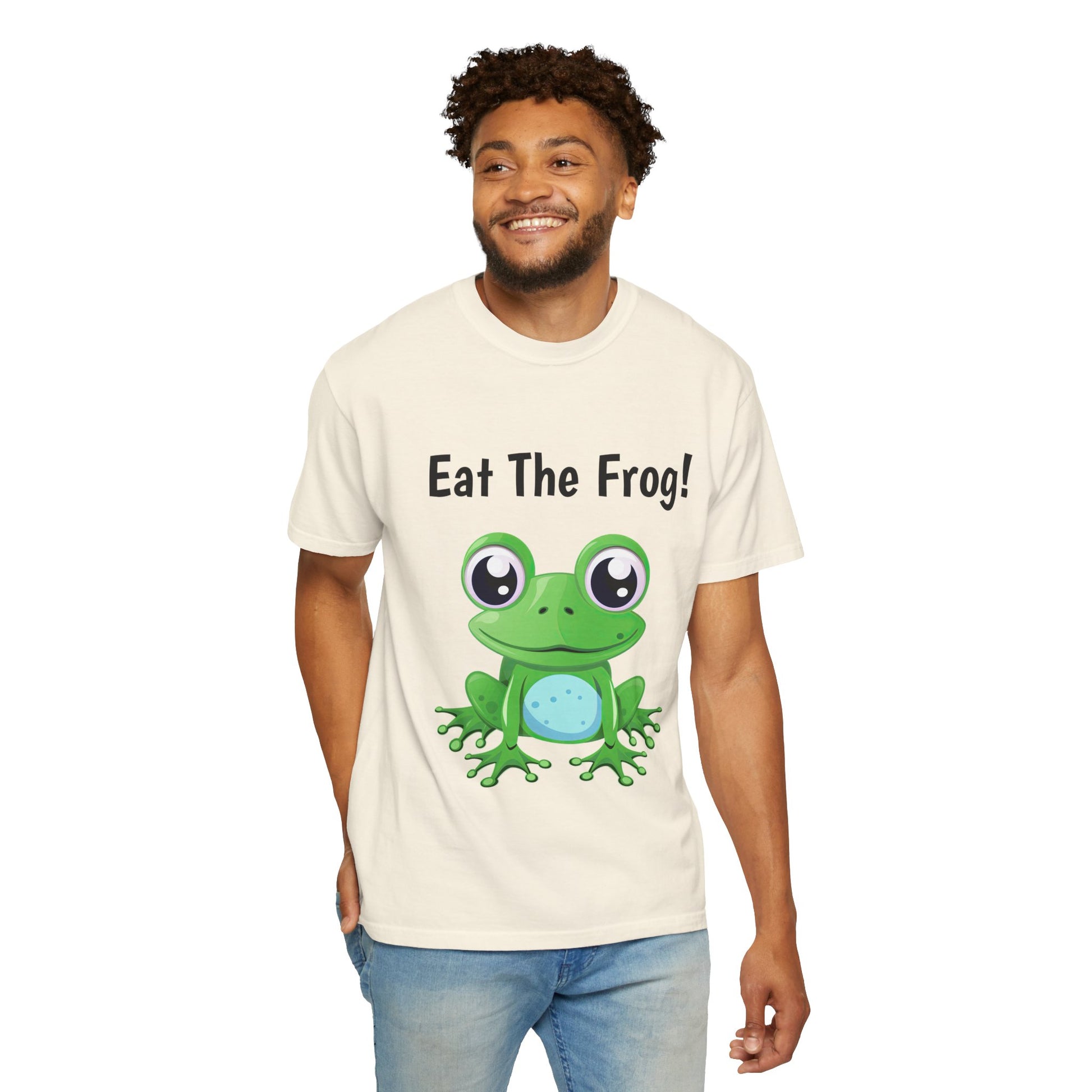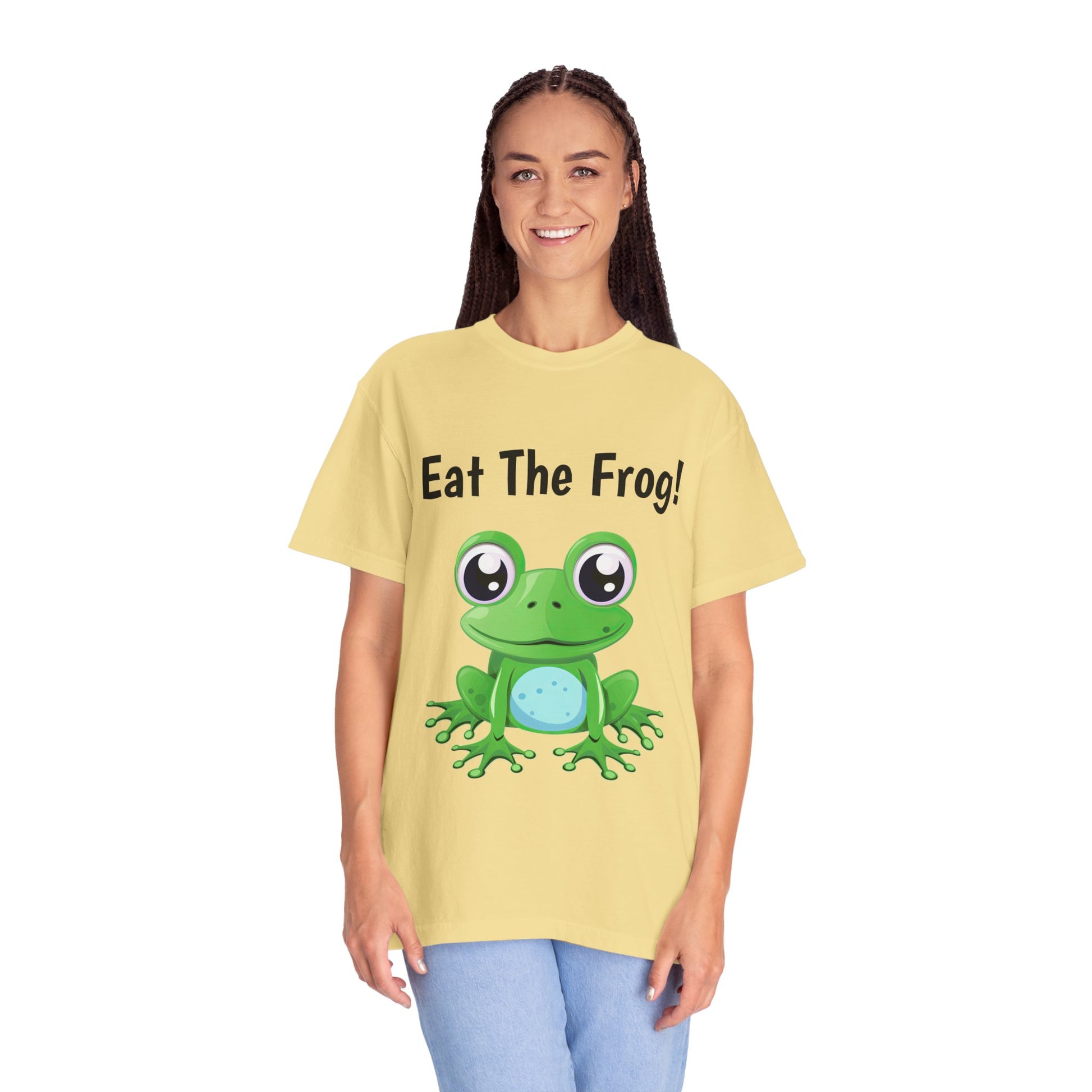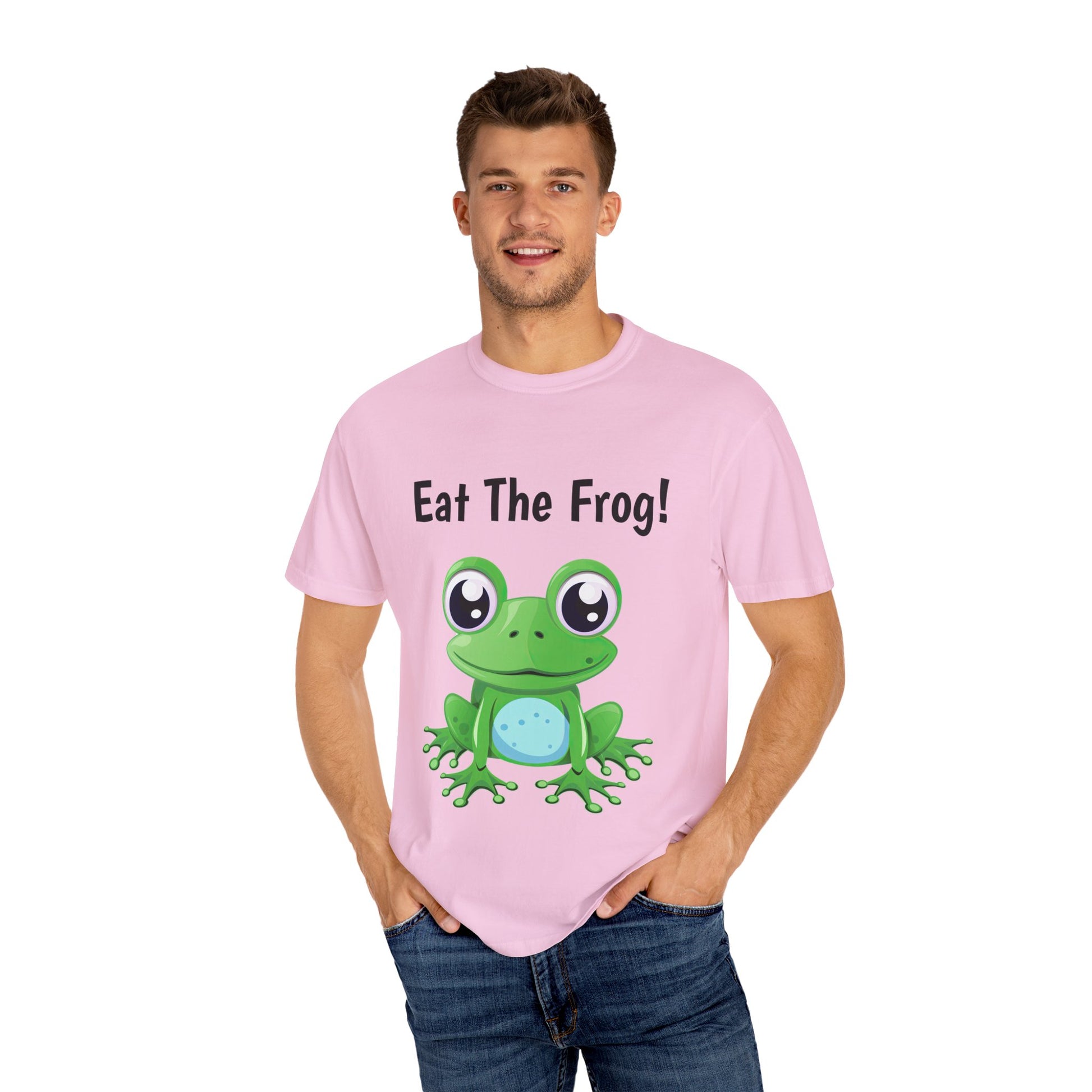 Inspirational Eat the Frog! T-shirt. Comfort Colors introduces its garment-dyed t-shirt; a fully customizable tee made 100% with ring-spun cotton. The soft-washed, garment-dyed fabric brings extra coziness to your wardrobe while the relaxed fit makes it an excellent daily choice. The double-needle stitching throughout the tee makes it highly durable while the lack of side-seams helps the shirt retain its tubular shape.