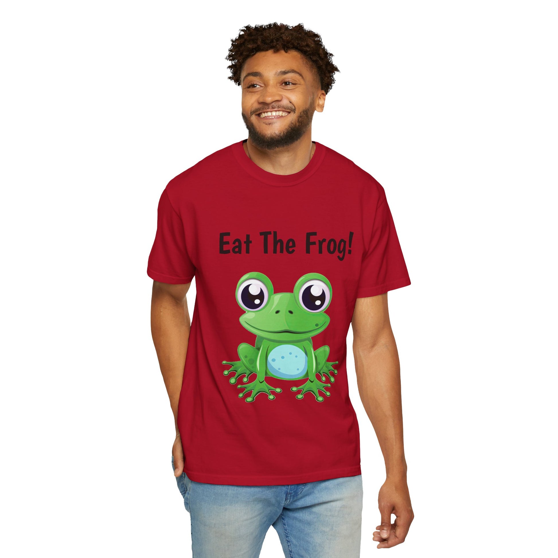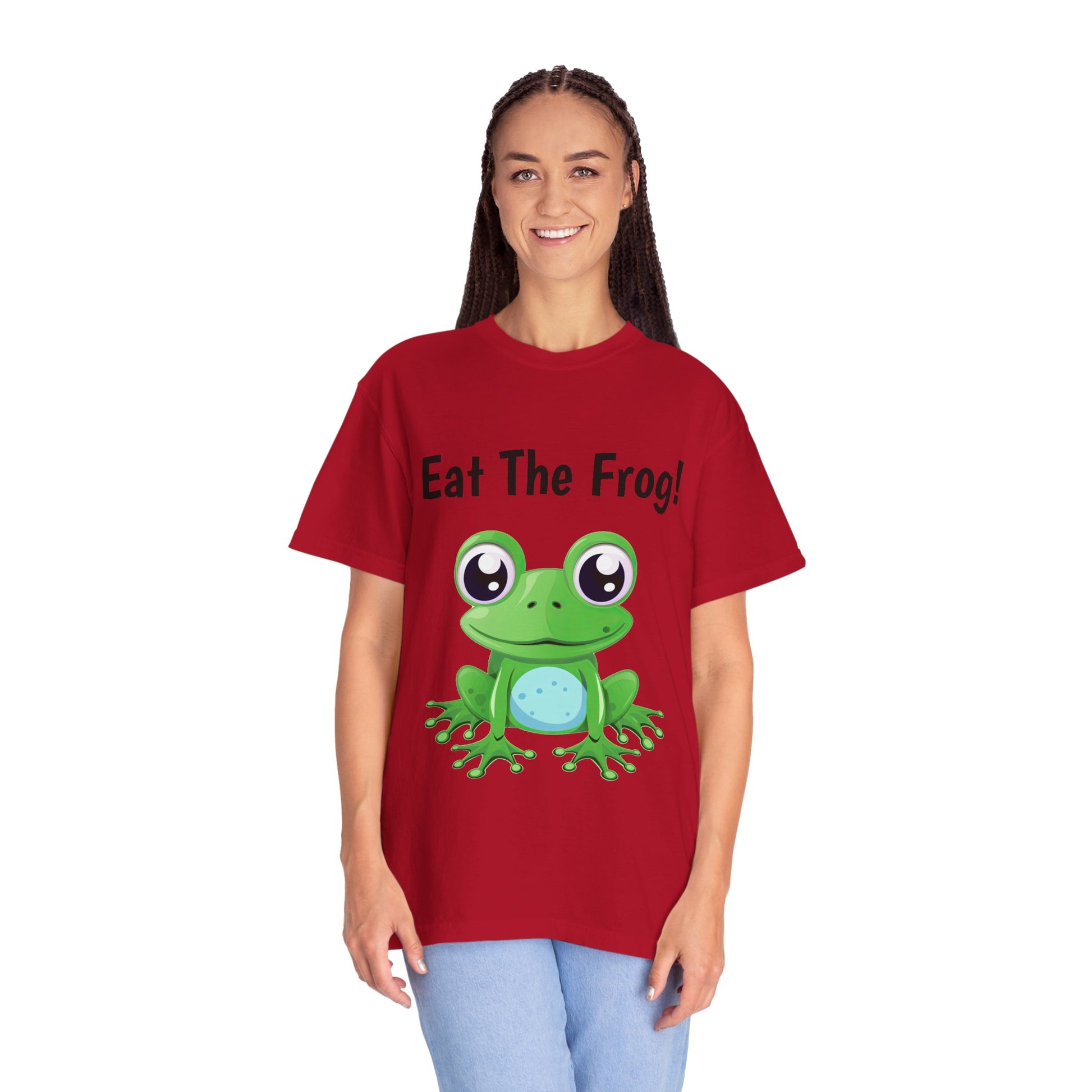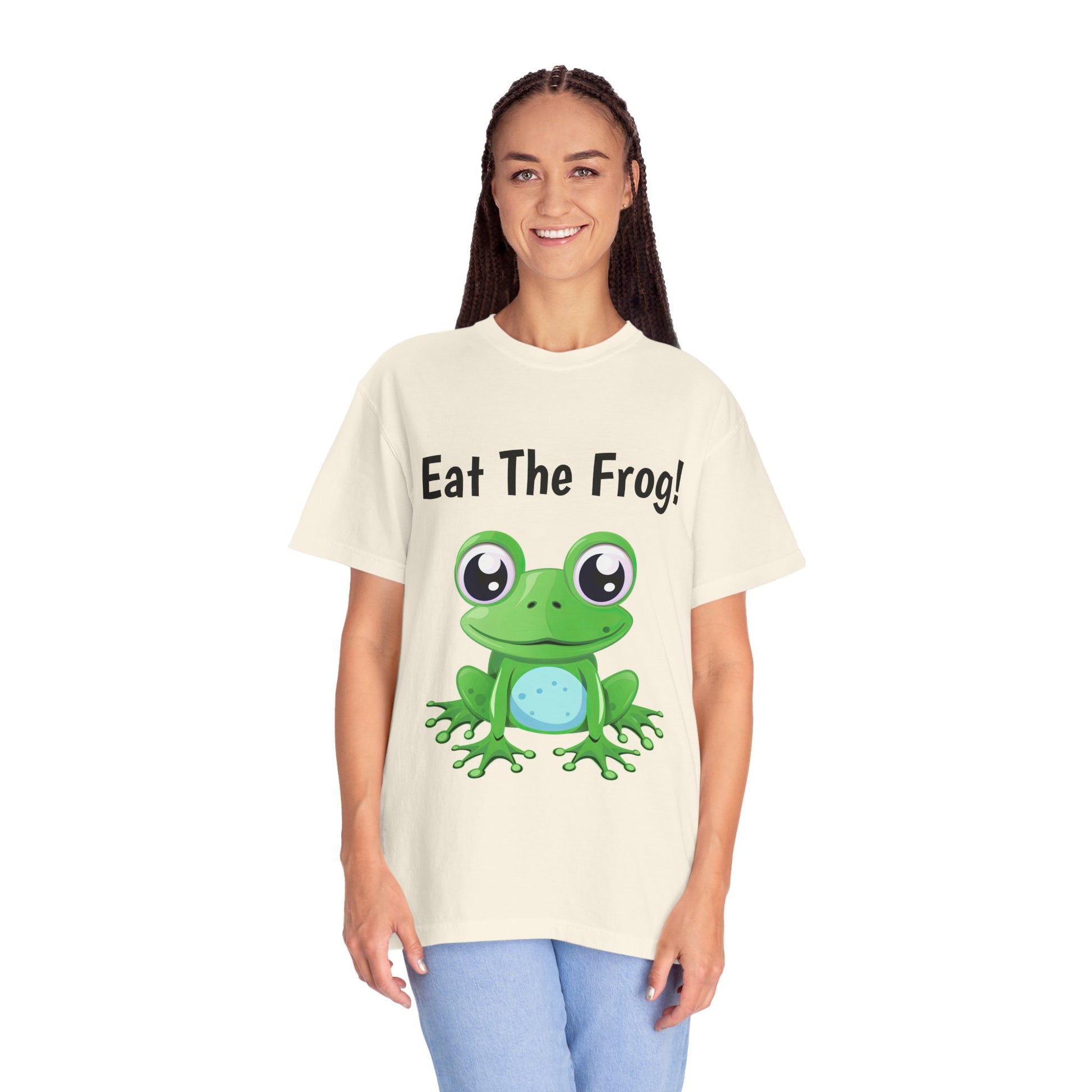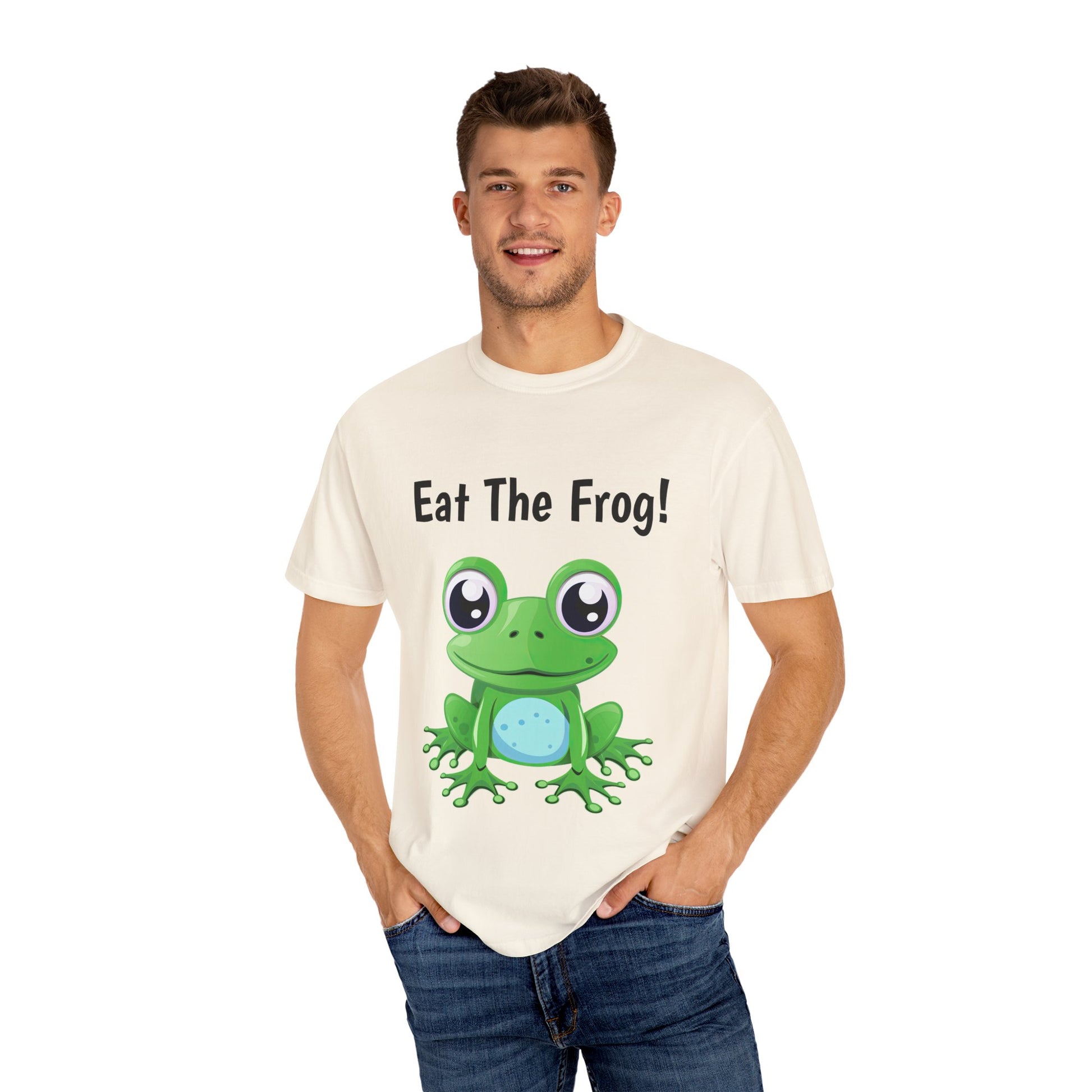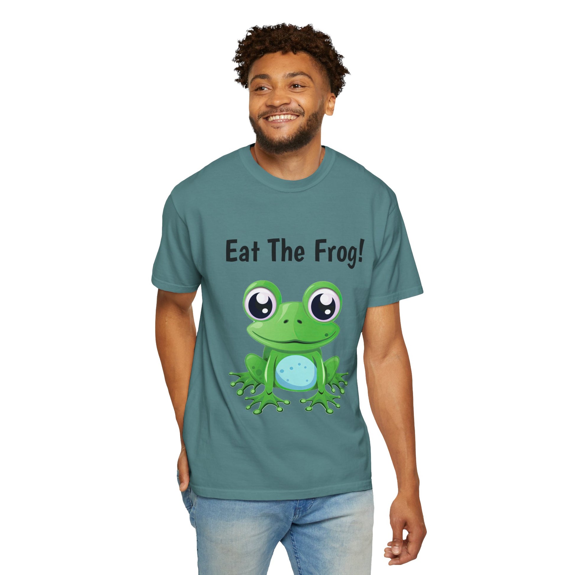 Inspirational Eat the Frog! T-shirt. Comfort Colors introduces its garment-dyed t-shirt; a fully customizable tee made 100% with ring-spun cotton. The soft-washed, garment-dyed fabric brings extra coziness to your wardrobe while the relaxed fit makes it an excellent daily choice. The double-needle stitching throughout the tee makes it highly durable while the lack of side-seams helps the shirt retain its tubular shape.