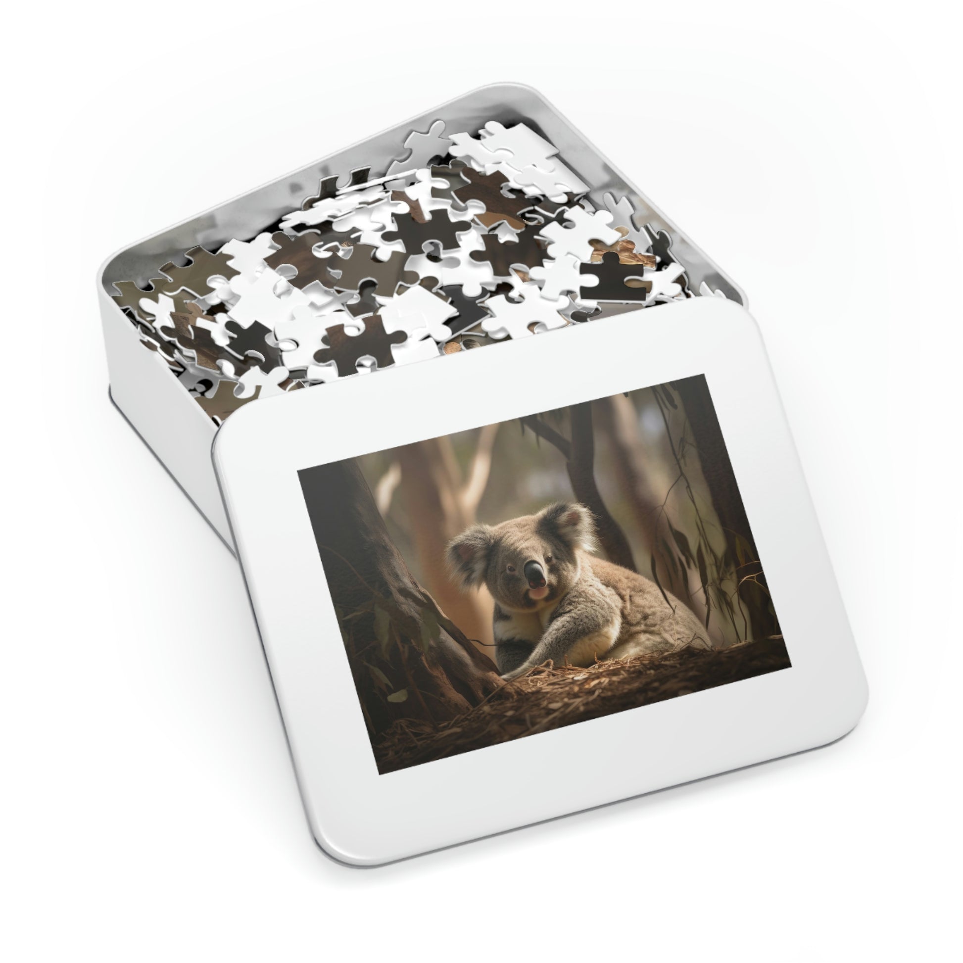 Elegantly packaged in a white metal tin box featuring the finished image on the cover, our Koala's Tranquil Siesta Puzzle is the perfect gift for relaxation seekers, animal lovers, and puzzle connoisseurs.