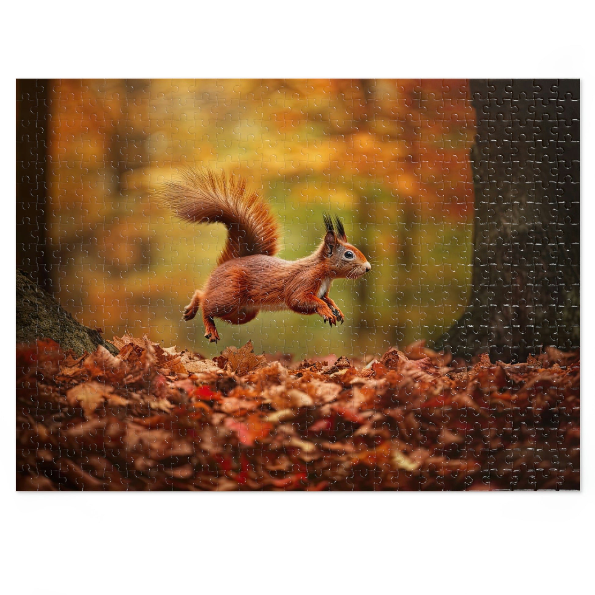 Delight in the playful spirit of woodland creatures with our third Squirrel's Forest Frolic Puzzle, featuring an endearing image of a lively squirrel leaping and scampering through the vibrant forest foliage. Available in 500 and 1000-piece options, this high-quality jigsaw puzzle offers hours of engaging fun for children (ages 9+) and adults. Each puzzle is crafted from durable pre-diecut chipboard with a satin finish, ensuring precise interlocking pieces and a delightful assembly experience.
