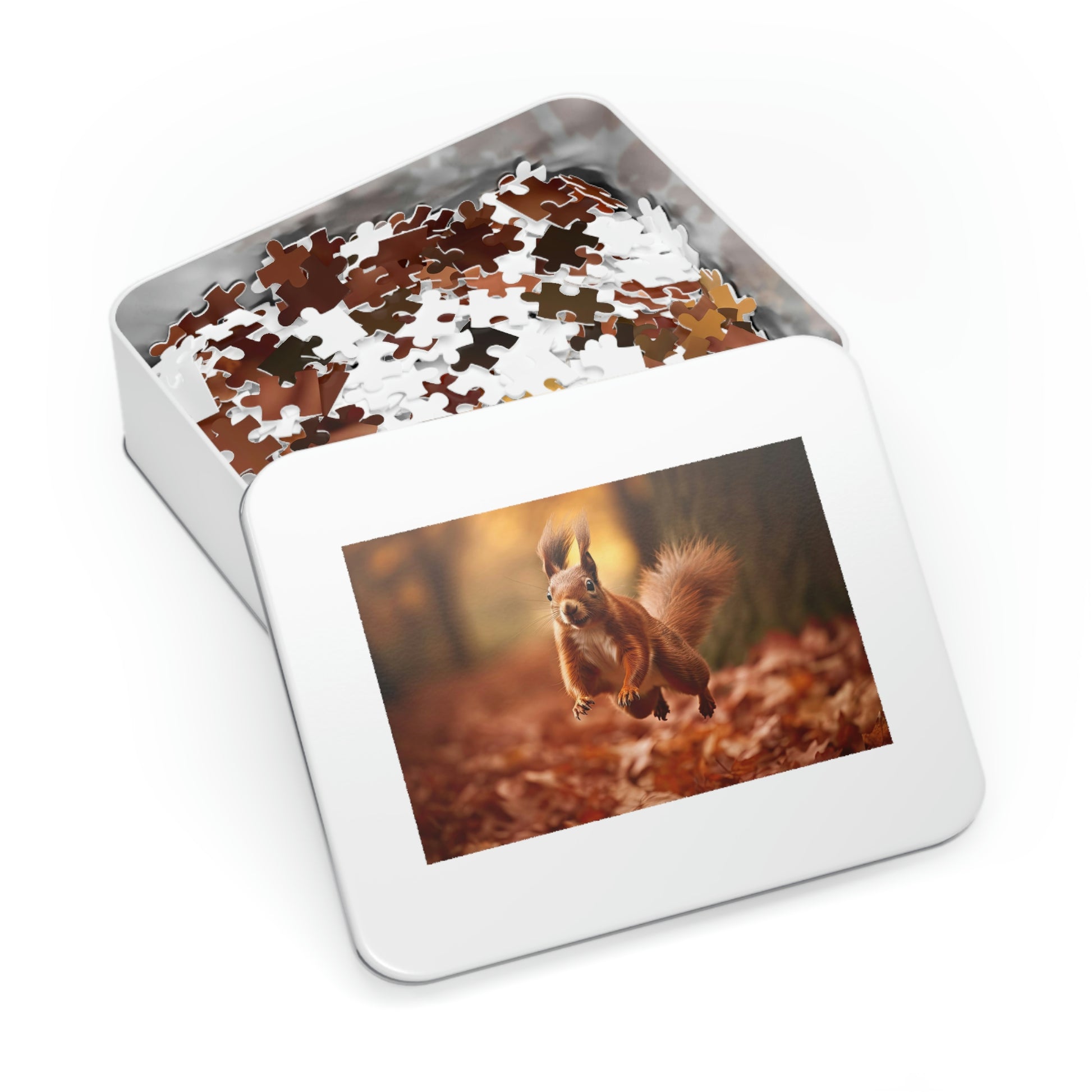 Elegantly packaged in a white metal tin box featuring the finished image on the cover, our Squirrel's Forest Frolic Puzzle is the perfect gift for nature enthusiasts, animal lovers, and puzzle connoisseurs.