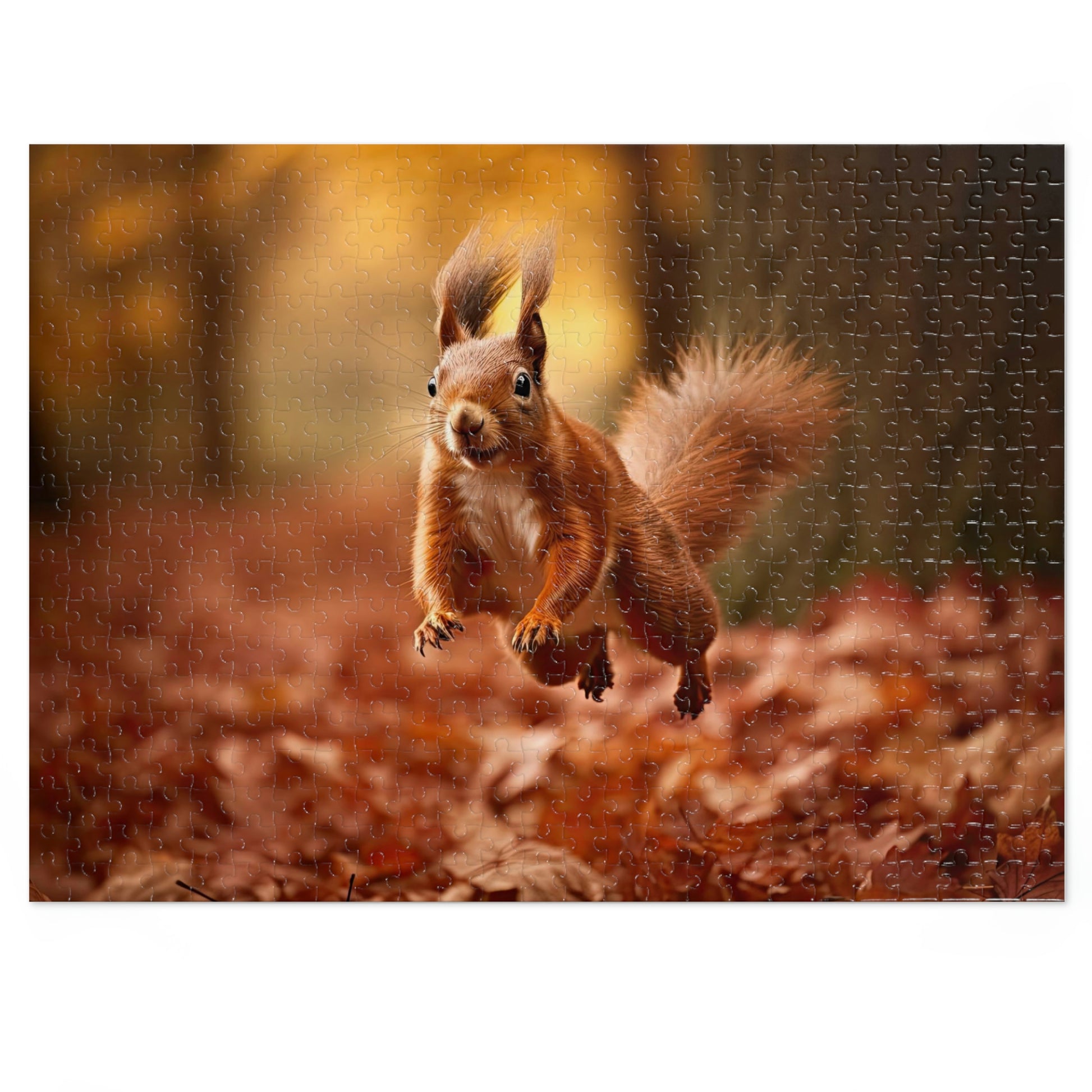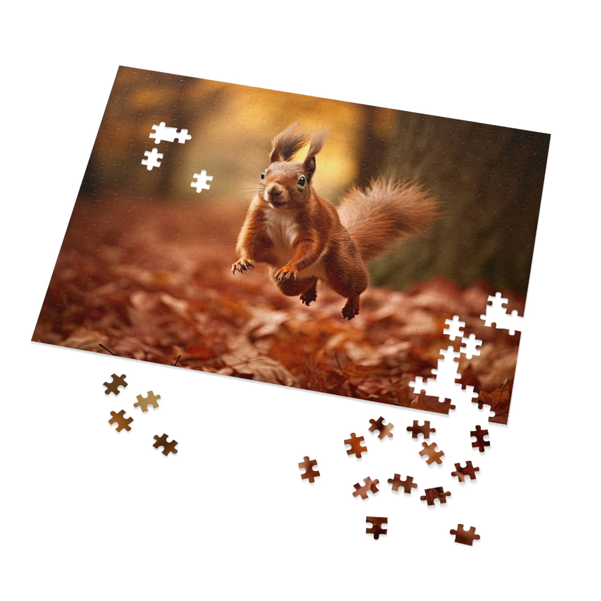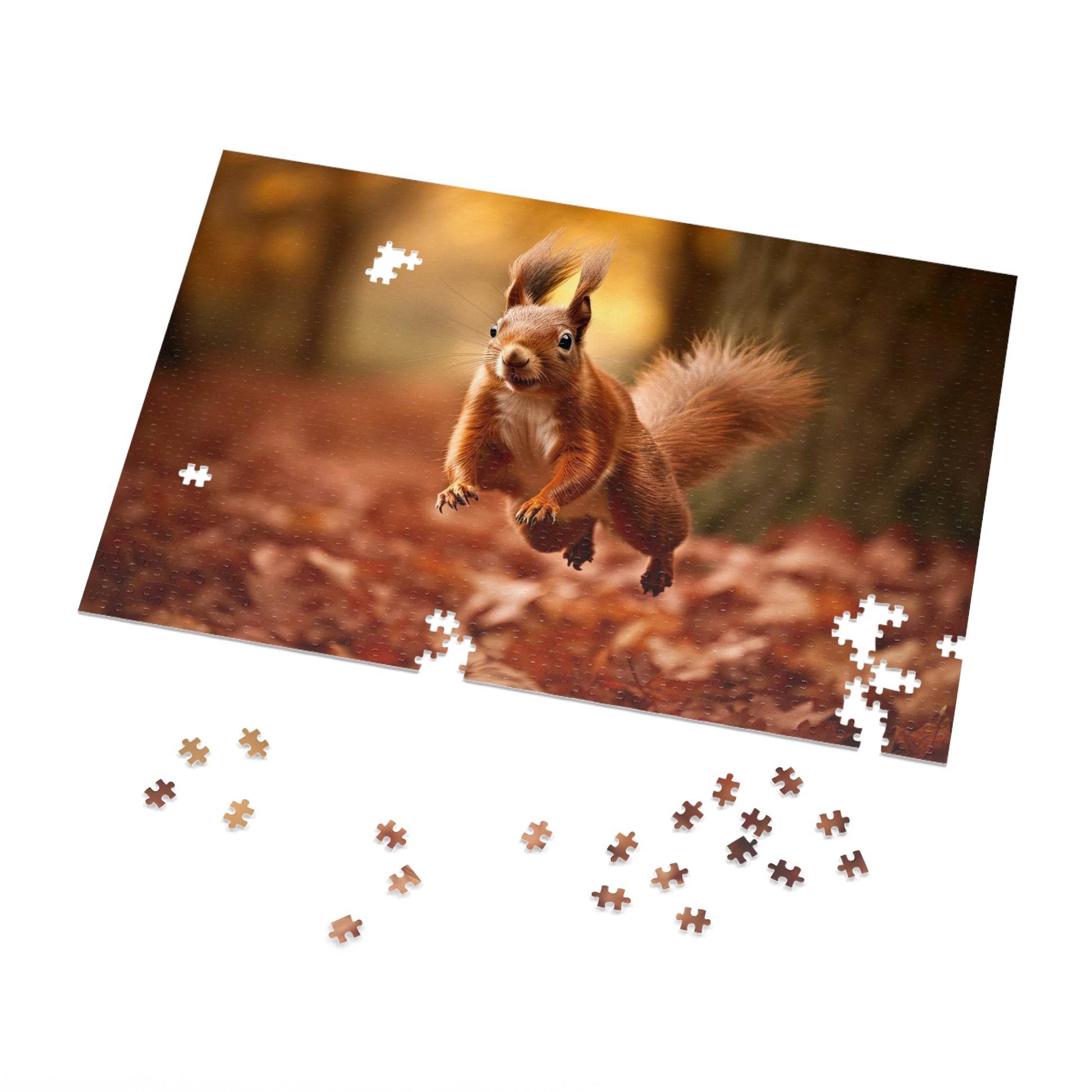 Delight in the playful spirit of woodland creatures with our fourth Squirrel's Forest Frolic Puzzle, featuring an endearing image of a lively squirrel leaping and scampering through the vibrant forest foliage. Available in 500 and 1000-piece options, this high-quality jigsaw puzzle offers hours of engaging fun for children (ages 9+) and adults. Each puzzle is crafted from durable pre-diecut chipboard with a satin finish, ensuring precise interlocking pieces and a delightful assembly experience.