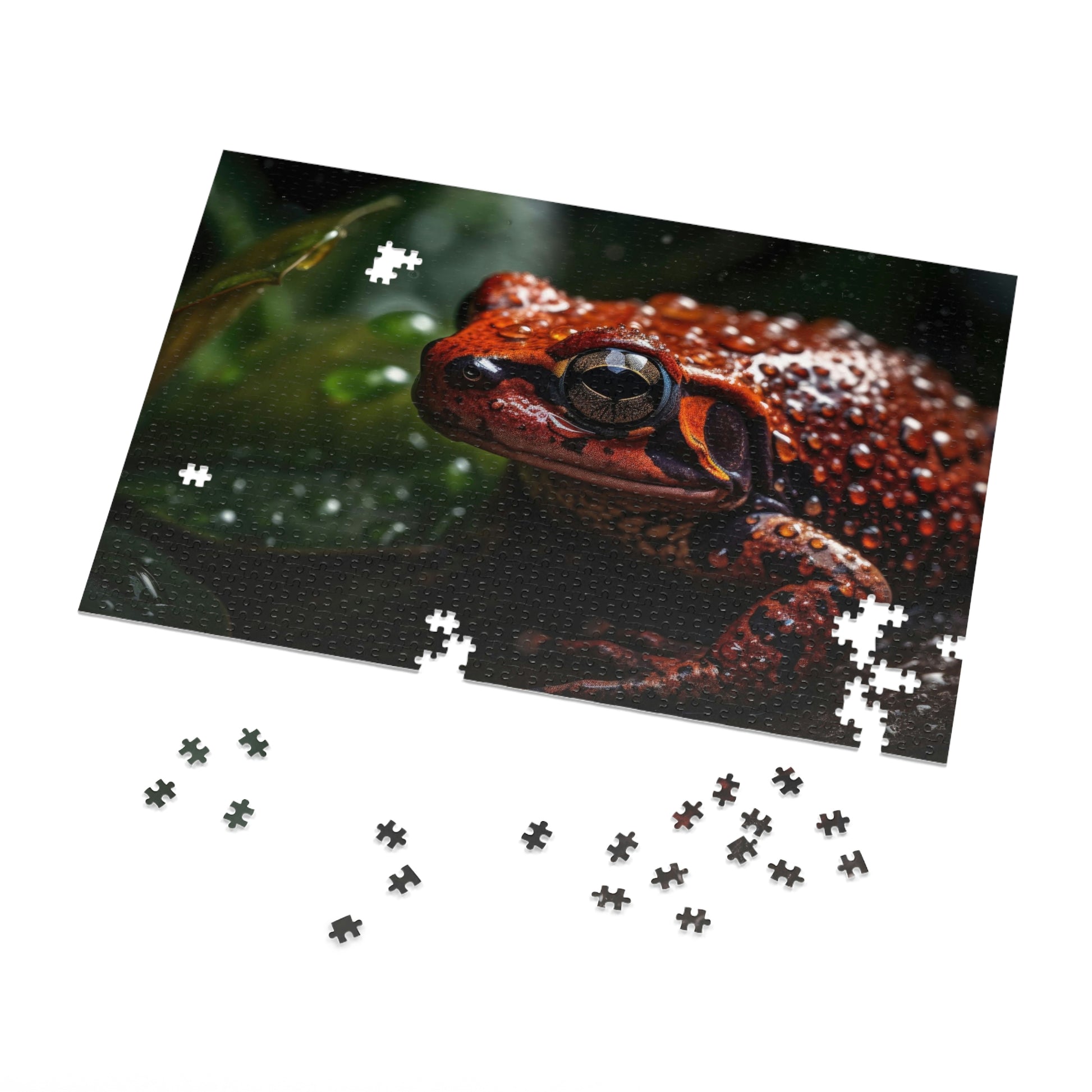 Delight in the wonders of nature with our second Whimsical Frog Oasis Puzzle, showcasing a charming image of a vivid frog nestled amid vibrant foliage and glistening water droplets. Available in 500 and 1000-piece options, this high-quality jigsaw puzzle offers hours of engaging fun for children (ages 9+) and adults. Each puzzle is crafted from durable pre-diecut chipboard with a satin finish, ensuring precise interlocking pieces and a delightful assembly experience.